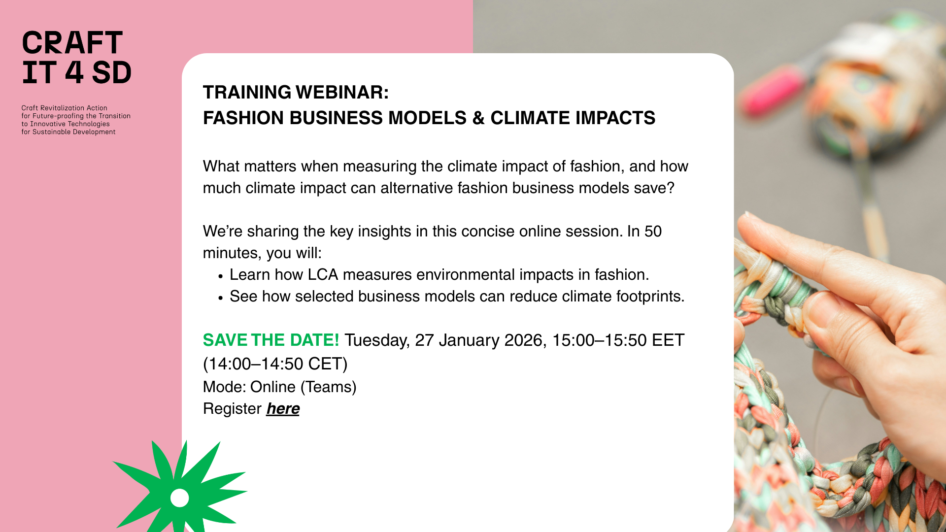 As part of the project, VTT Technical Research Centre of Finland assessed the climate impacts of selected fashion business models. Now, they invite you to an online training webinar where we will share these insights.