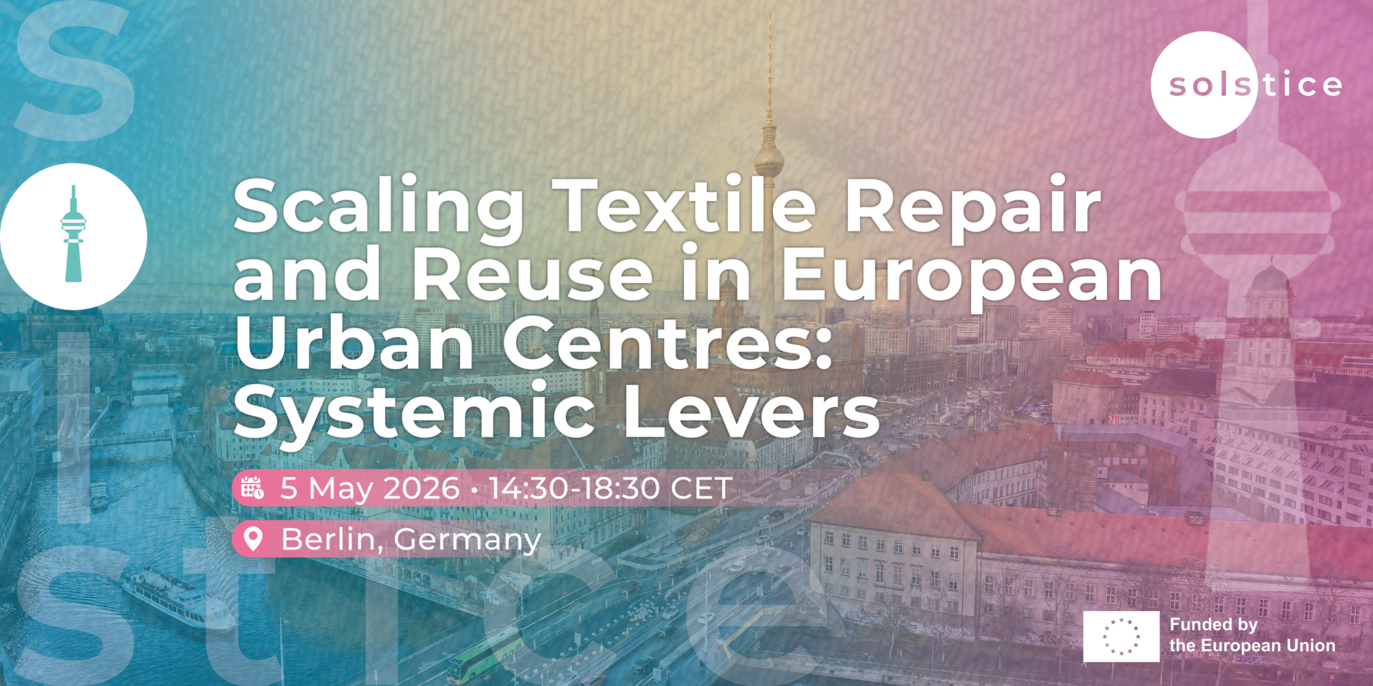 Join SOLSTICE in Berlin for “Scaling Textile Repair and Reuse in European Urban Centers: Systemic Levers”, a half-day event exploring how repair and reuse can be scaled across European cities through cultural, governance, and market-driven solutions. This on-site gathering on the afternoon of 5 May 2026 will feature expert presentations, a high-level panel discussion, and a guided visit to an innovative textile microfactory, offering practical insights into systemic change for circular textiles.